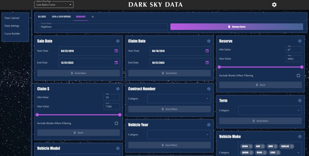 Dark Sky Data's Loss Ratio Tool gives a clear view across products, make/model/year, dealerships, and vintages. Better visibility means faster, more confident underwriting and pricing decisions.